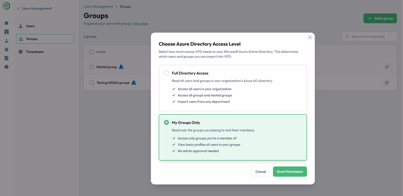 The Azure Group feature streamlines employee directory management by pulling groups and users directly from Azure Active Directory. To get started, enable the Azure integration, choose between full directory access or access limited to your own groups, accept the permission request, and then select which groups to import. Once imported, you can keep everything up to date by clicking "Azure sync now" in the group's Edit tab whenever changes occur in Azure.