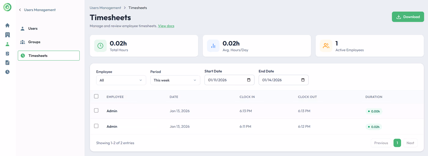 This feature is available exclusively with the Enterprise license, reflecting its advanced workforce tracking capabilities. Once enabled, users can clock in and out from the main dashboard, and all recorded session data is automatically logged and accessible through the dedicated Timesheet section in the left-hand navigation menu.