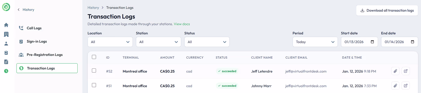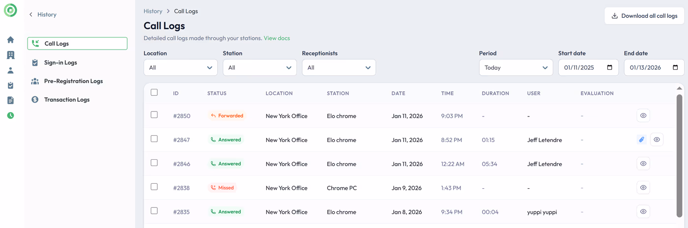 The History tab is a centralized hub within your platform that gives administrators and receptionists full visibility into past activity across multiple areas of operation. Whether you need to review a specific call, audit visitor sign-ins, track pre-registration statuses, or reconcile payment transactions, the History tab provides all the detail you need in one place.