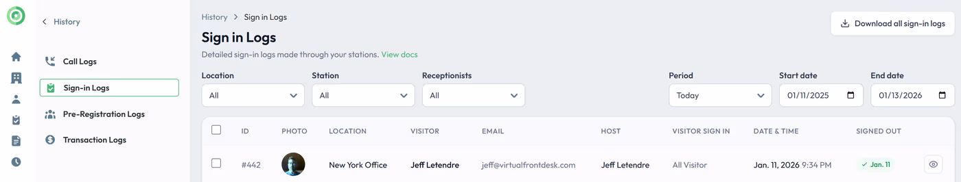 Here, you'll find a comprehensive history of all sign-in forms, along with responses to the form questions, signed documents, and any pictures taken during the sign-in process.