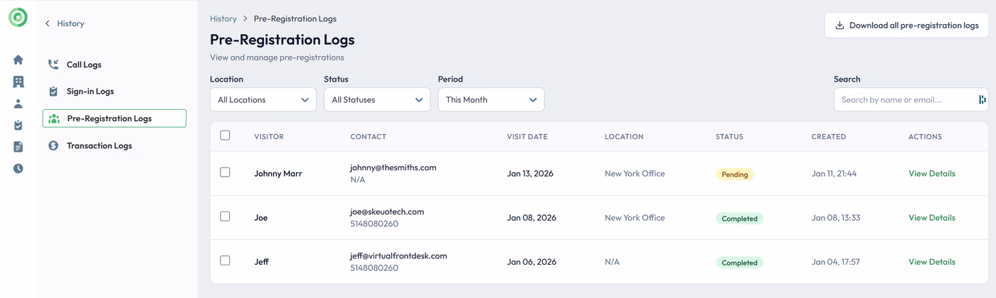 View the list and status of your pre-registrations. Pending means the pre-registration has been sent but not yet completed. Completed means the visitor has filled out the form.