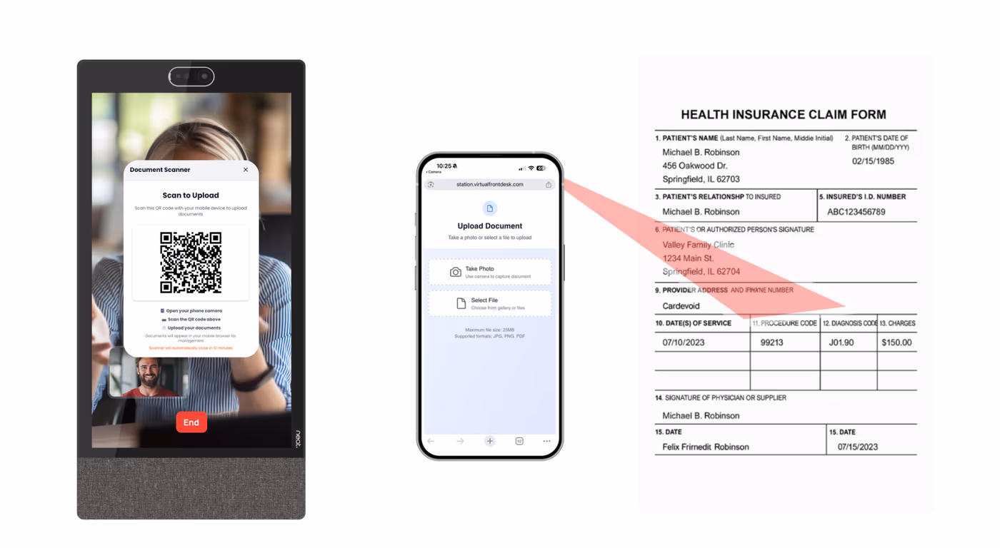 The scanner feature does not require any physical hardware. It uses the visitor’s own device. During a live call, the host can click the "Scanner" button, which displays a QR code on the station screen. The visitor scans this code with their phone, opening a secure browser page that allows them to either take a photo of a document or upload one from their phone's image library. Visitors can upload multiple images. On the host side, a live preview appears to confirm the image quality before submission. All uploaded documents are saved in the call history for future reference.