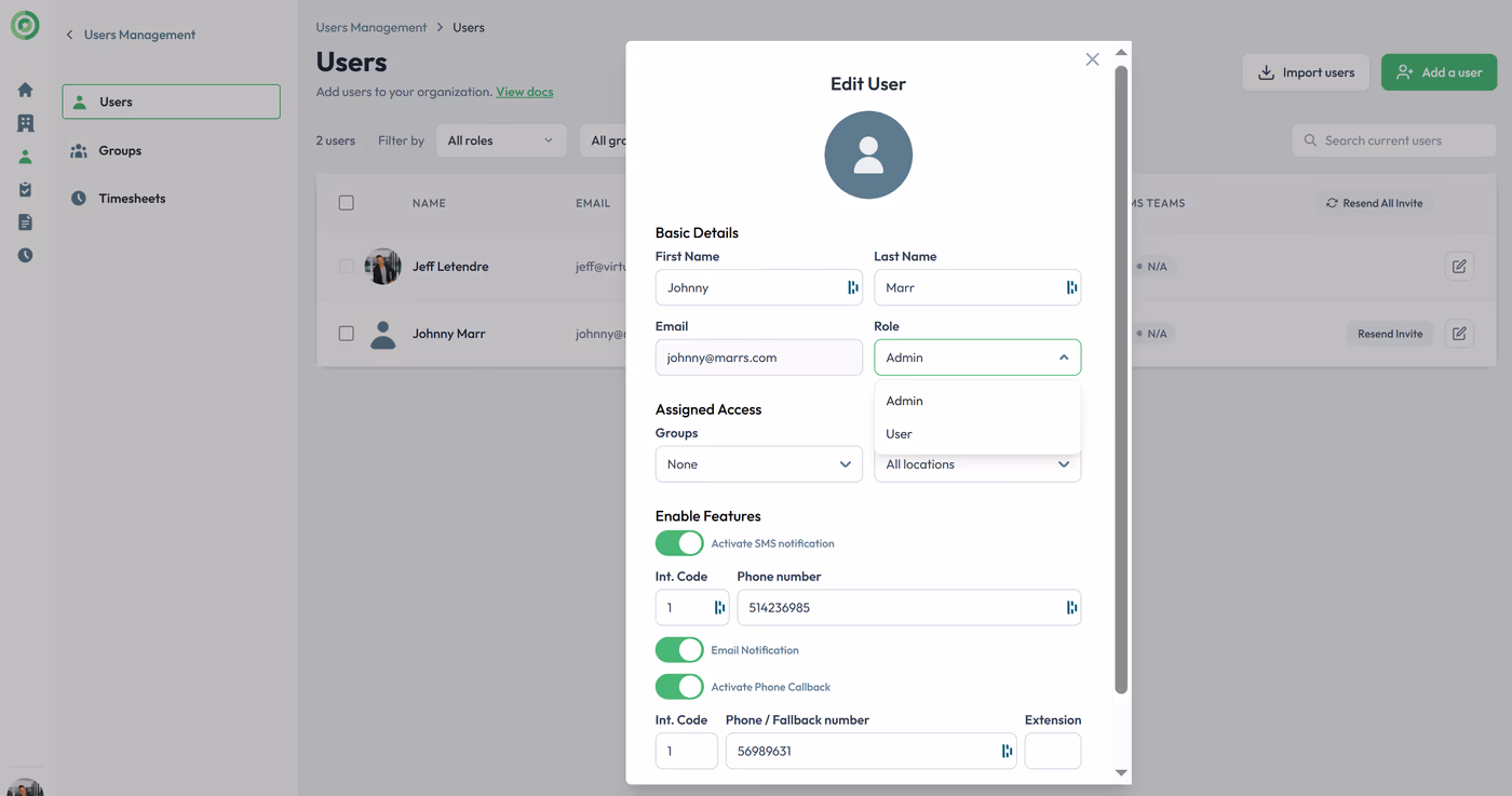 By default, all new users added to the account will have regular user roles with limited access to features. However, you can promote any regular user to an admin role by selecting "Admin" in the user’s settings under the user management section.