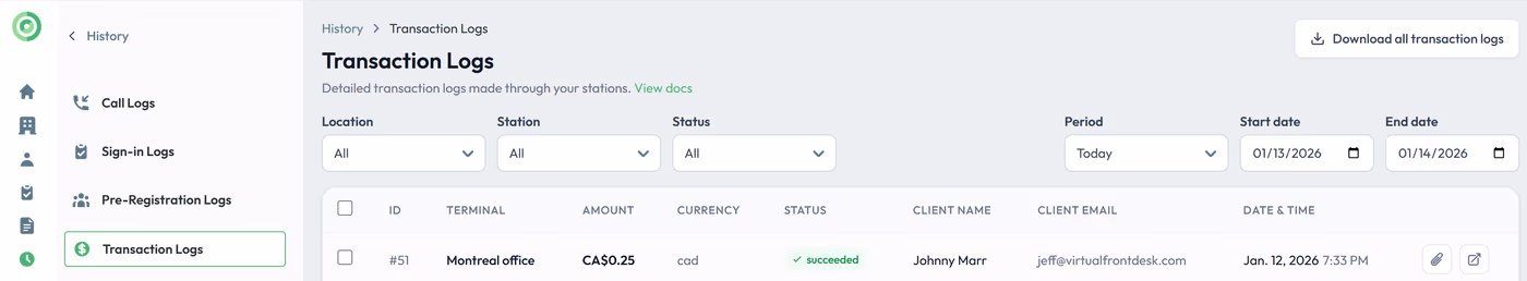 After the transaction is complete, a copy of the invoice and receipt will be emailed to the customer. For easy reference, all transactions are saved in the Virtual Front Desk Dashboard under the History tab > Transaction Logs.