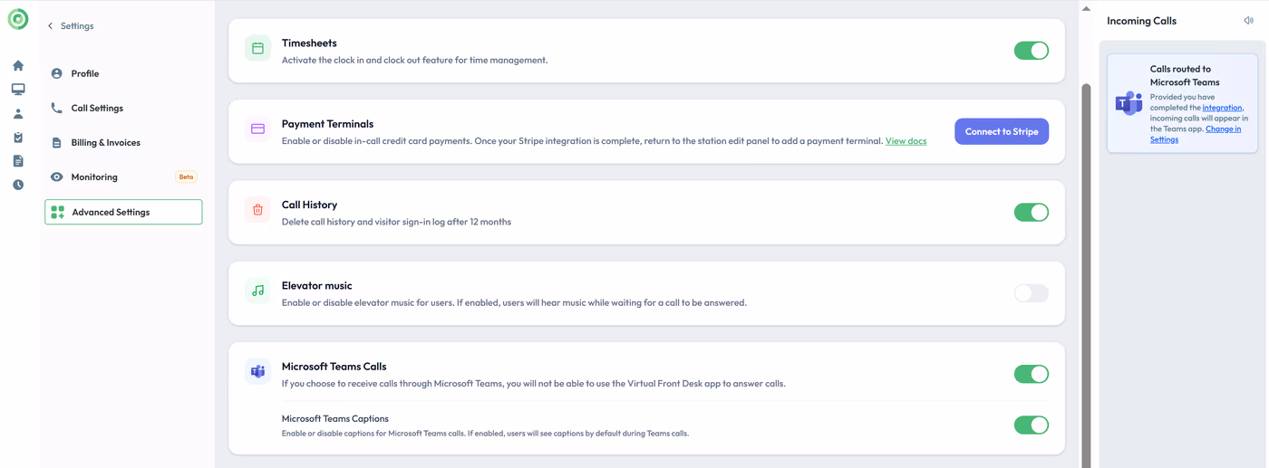 Next, go to your Virtual Front Desk dashboard, navigate to Settings > Advanced Settings, and enable both Microsoft Teams and Microsoft Teams SMS.