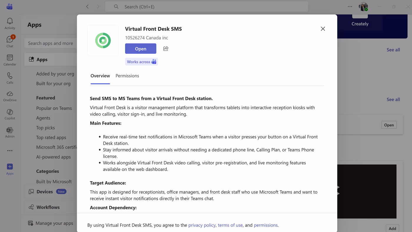 Then, open Microsoft Teams, search for “Virtual Front Desk SMS” in the app store, and install the app.